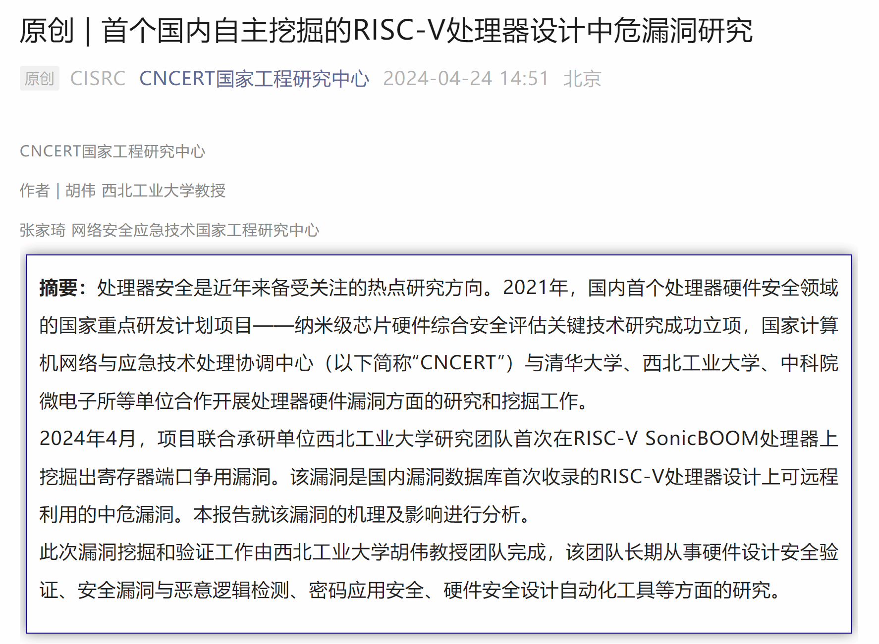 胡伟教授团队在RISC-V SonicBOOM处理器设计中挖掘出中危漏洞。这是国内首个自主挖掘的RISC-V处理器设计上可远程利用的中危漏洞,也是国内首个处理器硬件安全领域国家重点研发计划项目——纳米级芯片硬件综合安全评估关键技术研究的重要进展。
