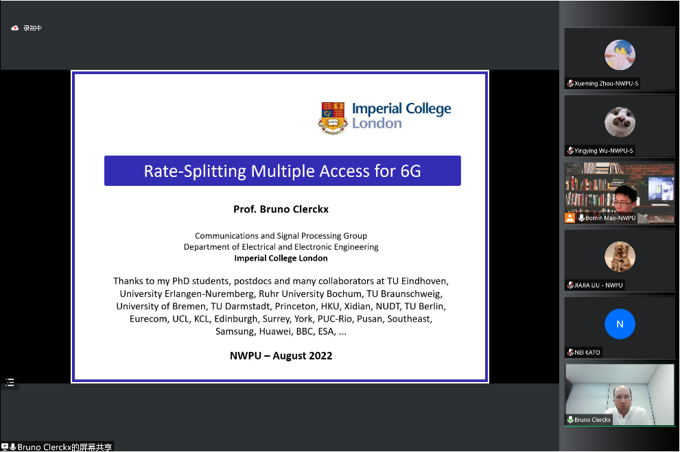 澳大利亚工程院院士、IEEE Fellow、悉尼大学Abbas Jamalipour教授做了题为“The Role and Challenges of Wireless Virtual Reality in Future Networks”的报告,围绕未来6G时代虚拟现实技术要求、挑战和安全风险进行了深入浅出的讲解;日本工程院院士、IEEE Fellow、日本东北大学NeiKato教授做了题为“6G Technologies for Supporting Smart IoT: Future Perspective”的报告,针对6G时代物联网关键技术和架构进行了系统性的分析和展望;IEEE Fellow、英国帝国理工学院BrunoClerckx教授做了题为“Rate-Splitting Multiple Access for 6G”的报告,对RSMA(Rate-Splitting Multiple Access)的原理和应用进行了详细介绍。此外,我院毛伯敏教授以Intelligent Resource Allocation and Task Scheduling in 6G Edge Networks为主题、郭鸿志副教授以Multi-UAV Cooperative Communications and Computing in 5G Advanced and Beyond为主题、于银菠副教授以The Security of Control Logic in Software: From Tradition to Intelligence为主题、张尚伟副教授以Design and Optimization of RSMA for Coexisting HTC/MTC in 6G and Future Networks为主题、刘倍源副教授以Optimal Beamformer Design for Millimeter Wave Dual-Functional Radar-Communication Based V2X Systems为主题、徐赛副教授以Intelligent Reflecting Surface Backscatter Communications为主题分别作了学术报告。