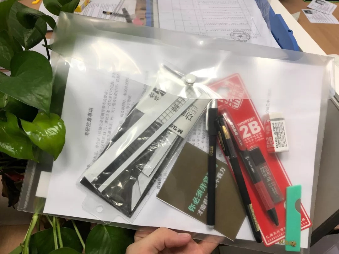 学工干部们开始着手准备与设计爱心文具袋,学工干部们考虑到了考场中对文具袋的多方面要求,在不能违反考试纪律要求的同时,又要设计得美观大方,体现出深切的祝福。最终,学工干部选择了透明笔袋,在封面上嵌入印有 “祝考研的你 考的全会写的全对”的祝福语的励志卡片,并在笔袋中放入了2B铅笔、黑色水性笔、格尺等考试必备文具。