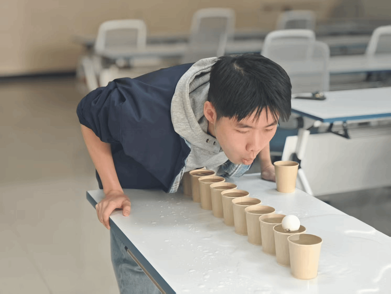 上午11时,本届院运会的乒乓球吹球接力赛在网安学院楼101举行。这项赛事中,运动员需要使用吹气方式使乒乓球依次通过5个盛水纸杯(间距50厘米),掉落需放回重试,计时最短者胜。运动员屏息俯首,用呼吸操控着乒乓球在湿滑杯沿间跃进,飞溅的水珠与倒计时器上的数字同步震颤。最终,徐瑞同学荣获冠军,黄远鑫同学荣获亚军,张恩玮同学荣获季军。