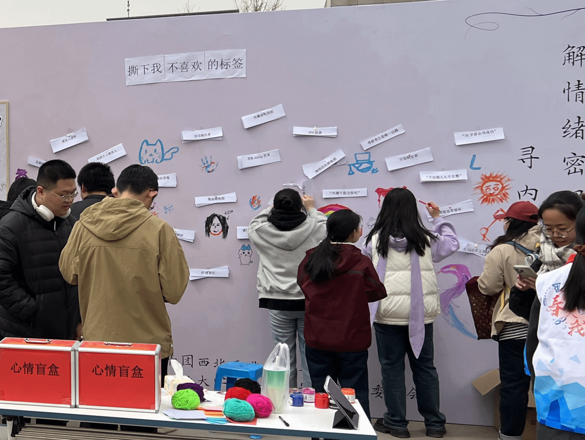 这一面墙上贴满了种种人生被定义的负面标签,参与者们面对着这些具有强烈冲击感,直面灵魂深处的问题,起初的犹豫最终还是化作了清脆的撕裂声。当"社恐""拖延症"等标签纷纷飘落,参与者们豁然开朗。有位同学激动地说:"原来撕掉这些纸片,就像解开了束缚自己人生的枷锁!"