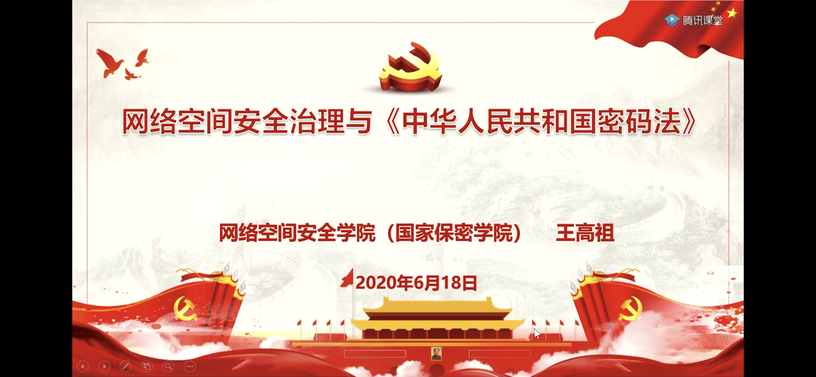 组织开展《中华人民共和国密码法》线上宣讲活动,学院党总支副书记(主持工作)王高祖担任主讲,全院学生和部分2019级信息大类学生参加宣讲活动。本次活动也是我校2020年全民国家安全教育日密码法治宣传教育活动之一。