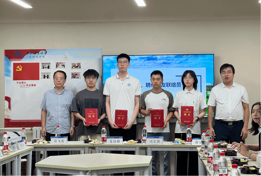 随后,会议举行了2025届本科毕业生校友联络员聘任仪式。刘志强宣读了聘任决定张文涛、王震共同为翁宇瑄、夏铭徽、司文强、郑飞虎四位2025届校友联络员颁发聘书并合影留念。希望他们在今后的学习与工作中,继续发挥纽带桥梁作用,积极参与校友服务与联络工作,为推动校友与母校间的联系与发展贡献青春力量。