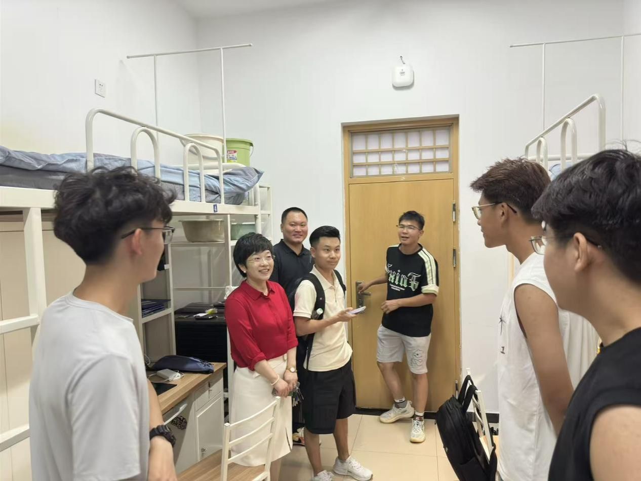 高度重视新生入学适应情况。迎新期间,张文涛、杜瑶分别带领辅导员、班主任等走访慰问了新生宿舍,与同学们亲切交流,细致询问大家入校后的生活适应情况,耐心解答同学们关于学业、生活等方面的疑问,并鼓励新生尽快转变角色,融入大学集体生活,珍惜舍友缘分,共同营造积极向上的宿舍氛围。