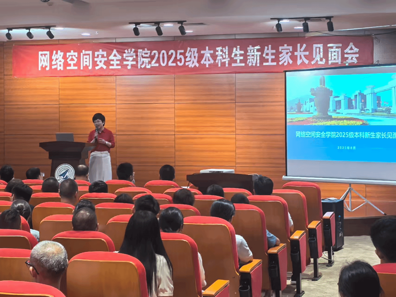 杜瑶详细介绍了学院管理队伍,新生年级辅导员、各班班主任,并从“1235”战略的学生工作思路出发,介绍了学院培养“总师型”网安领军人才的第二课堂育人内容。并与家长们约定四年后的毕业典礼再一起见证孩子们的幸福时刻。