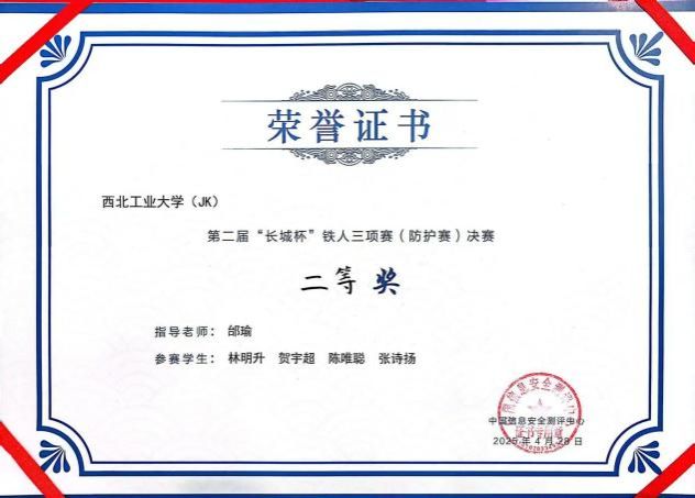 邰瑜老师指导的JK团队(成员:林明升、贺宇超、陈唯聪、张诗扬)也取得了优异成果,在本次“长城杯”铁人三项赛(防护赛)决赛中荣获二等奖,均刷新了我校在本赛事所取得的最好记录。