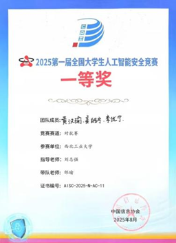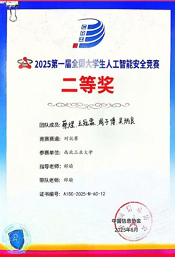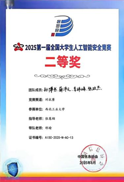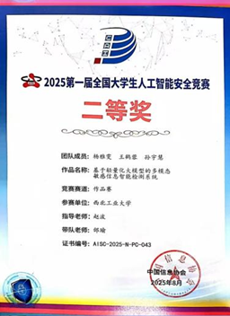 在2025年第一届全国大学生人工智能安全竞赛中,我校参赛团队凭借扎实的专业功底与出色的创新能力,取得一等奖1项、二等奖3项;在第二届“长城杯”铁人三项赛作品赛与防护赛中分别斩获一等奖2项与二等奖1项,我校也成为全国唯一双一等奖高校。