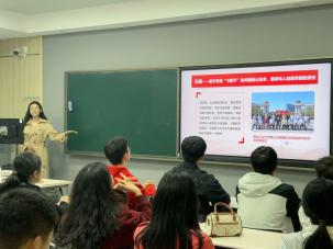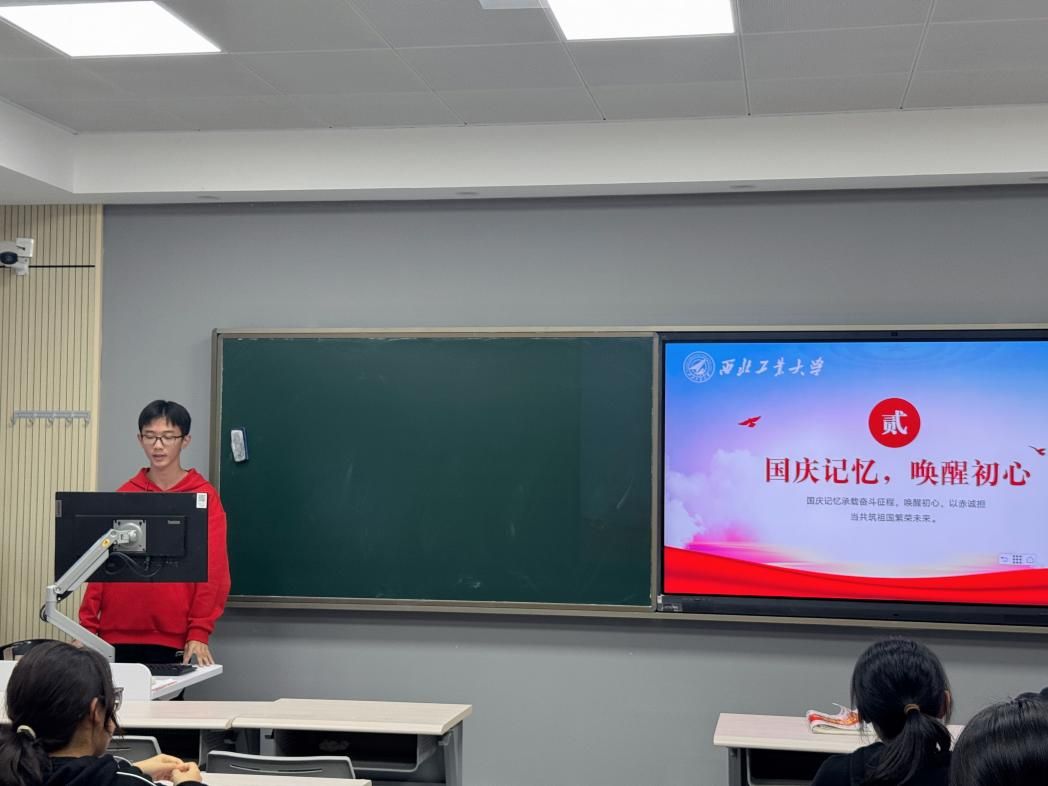 宣讲结束后,团支部书记韩墨以国庆记忆为主题展开分享。他从1949年开国大典的深远意义说起,延伸到国庆节在新时代的精神内涵,让同学们对国庆有了更立体的认识。活动还特别设置“红歌猜猜猜”互动环节,同学们在经典红歌的旋律中感受炽热的爱国情怀,让爱国种子在心中扎根。