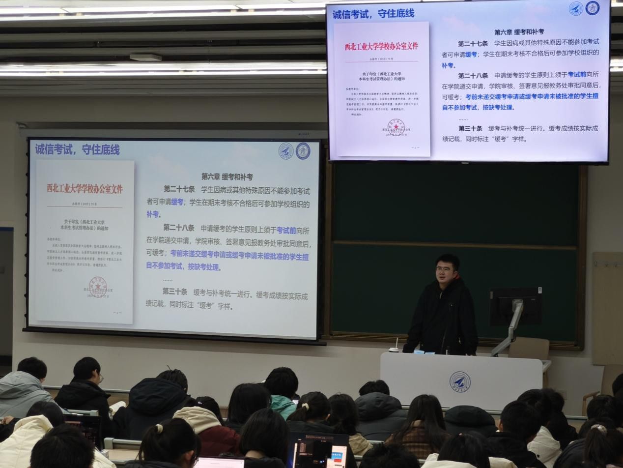 本科生考试管理办法》。他详细解读了办法中的各项条款,着重强调了考风考纪的严肃性。警示同学们要严格遵守考试规则,坚决杜绝任何作弊行为,以诚信的态度迎接期末考试,共同营造公平、公正、有序的考试环境。