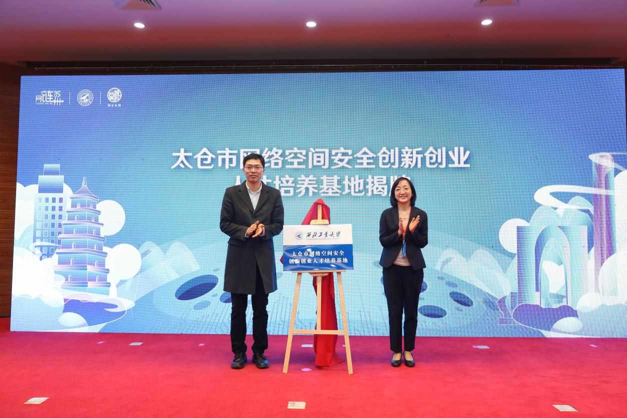 党委学生工作部部长、学生处处长代富平和太仓市网信办主任刘菊为太仓市网络空间安全创新创业人才培养基地揭牌。
