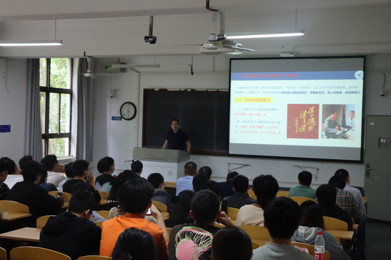 在讲座中黄涛主任带领学生们学习毛泽东、邓小平、江泽民、胡锦涛、习近平对保密工作的重要批示,分享毛泽东同志不同阶段对保密工作批示的小故事以及《出差守则》等;学习《保密法》《保密法实施条例》相关章节、十二条保密违法行为,以及目前保密工作面临的风险及对策。黄涛主任对学生们作出日常保密提醒,包括三条高压线及图片别乱晒、信息别乱发等内容。通过对上述内容的学习,促进同学们树立起保密意识和责任意识。