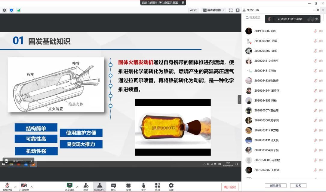 思政课以线上会议的形式进行,白总师以“追梦航天的固体探索道路”为题,结合中国航天事业的发展历程,从人类的飞天梦、固体动力简介、用航天精神引领航天探索之路等方面开展了讲课。白总师向广大师生讲述了飞天历程从神话到科学的探索历程,以及我国航天和国防事业(“两弹一星”)的发展、固体发射机研制、发展壮大和稳步前进直到走出独立自主的固体道路的经历。同时,为让广大师生更加了解固体发动机,白彦军总师介绍了固体发动机的基础知识,展示了固体发动机的组成和工作过程以及固体动力的特点、应用、分类等。他表示,固体动力机的发展对于中国航天事业有非常重要的作用。