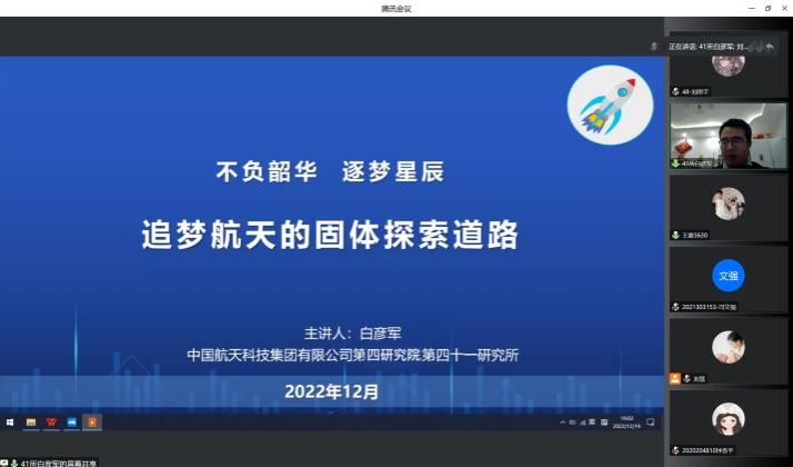 党总支邀请了中国航天科技集团公司第四研究院第四十一研究所白彦军总师为学院师生上了一堂生动的“不负韶华,筑梦星辰——追梦航天的固体探索道路”校友思政课,学院师生180余人聆听授课。