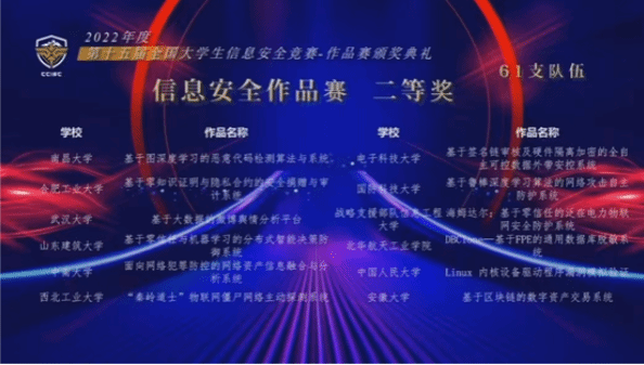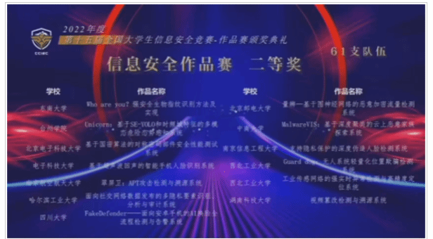 From August 20 to 24, 2022, the final of the 15th National College Students' Information Security Competition came to an end. The National College Students' Information Security Competition is one of the 56 "National College Students' Subject Competitions" initiated and sponsored by the Cyberspace Security Teaching Steering Committee of Higher Education of the Ministry of Education, supported by the Central Cyberspace Administration and recognized by the Ministry of Education. There are two types of competition: work competition and innovative practice ability competition. Our school has won three second prizes in the national works competition, one second prize in the national Innovation and practice ability competition, and one third prize.