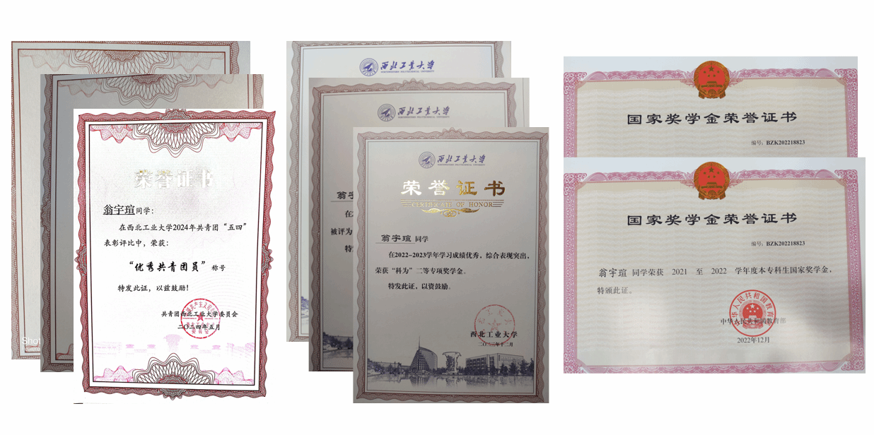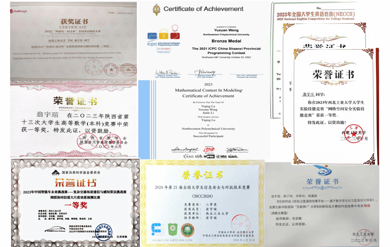 除了学习专业知识,翁宇瑄还积极投身网络安全、程序设计以及各类学科竞赛,获得过中国智能车未来挑战赛国家级一等奖、全国大学生英语竞赛国家级二等奖、陕西省大学生高等数学竞赛一等奖、陕西省大学生程序设计竞赛铜牌等主要奖项。