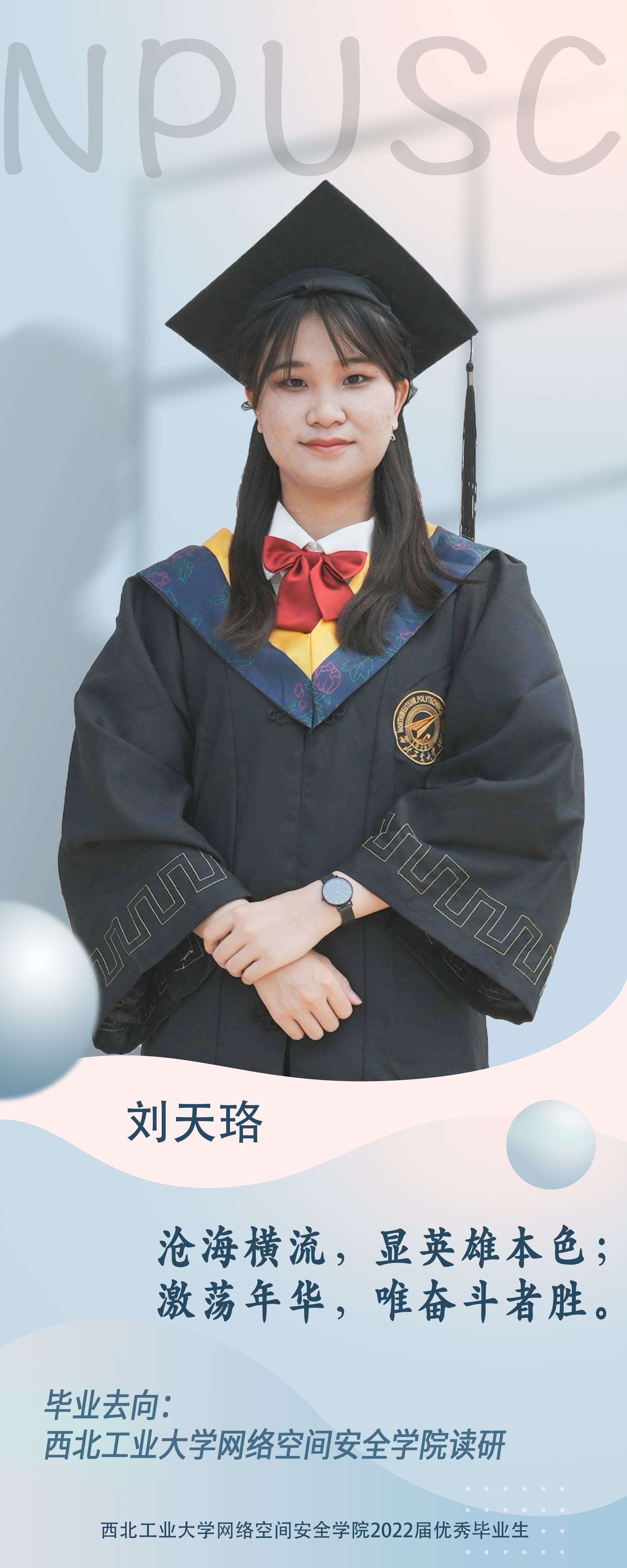 学院本科生刘天珞。本科期间参与国家级大创一项并获得优秀结题,主持省级大创一项,申请软件著作权三项,并获得“太仓杯”网络空间安全创新创业大赛校级一等奖等。曾多次获校级优秀学生、院级优秀学生。曾担任曾担任信息安全协会团支书、信息安全基础能力训练课程助教,也曾担任学生大使回母校进行宣讲,在网络安全志愿日活动中担任志愿者。