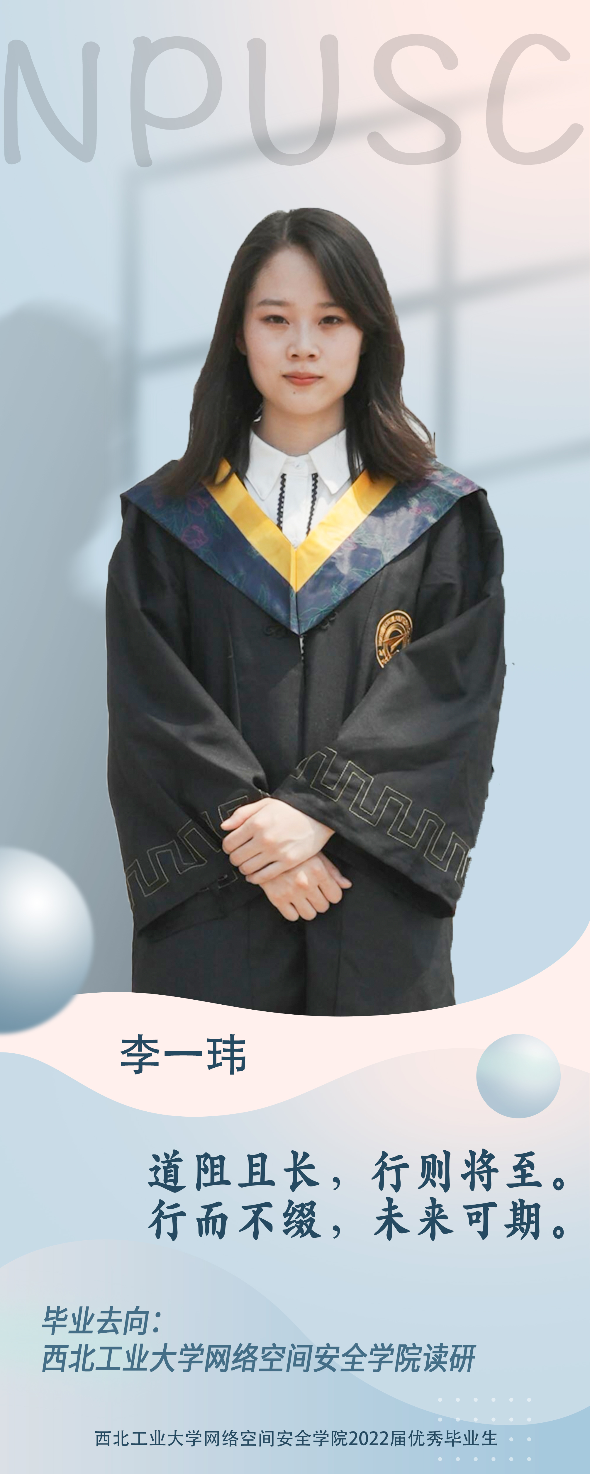 学院2018级本科生李一玮,本科期间获得校优秀学生奖学金1次、院优秀学生奖学金2次、优秀共青团员称号2次,在校期间认真学习专业知识,成绩优异。学习之余,她也积极参加学科竞赛,曾获得第十四届全国大学生信息安全竞赛作品赛国家级一等奖、2020中国机器人大赛无人机挑战赛国家级一等奖,第13届全国大学生数学竞赛陕西赛区非数学组三等奖等。