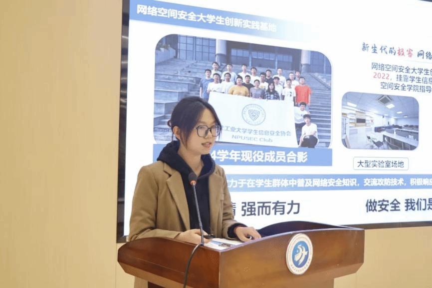 网络空间安全大学生实践基地常务副会长封阳阳代表基地做出分享,通过复现模范团队答辩过程,富有激情又不乏深刻的讲述了网安基地从众多基地中崭露头角的奋斗历程。对于基地建设的成功,封阳阳在讲述基地建设理念的同时,不忘感谢学院的大力支持。鼓励与会同学心怀极客精神,以家国情怀助力国家护网行动,为构建“总师型”网安领军人才培养体系添砖加瓦。