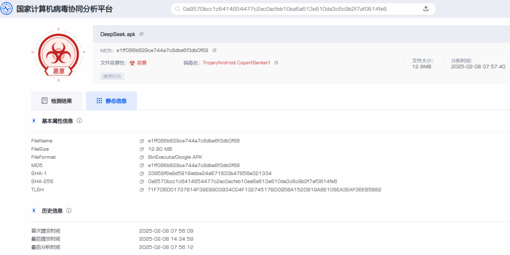 据国家计算机病毒应急处理中心消息,近日,国家计算机病毒应急处理中心和计算机病毒防治技术国家工程实验室依托国家计算机病毒协同分析平台在我国境内捕获发现仿冒DeepSeek官方App的安卓平台手机木马病毒。