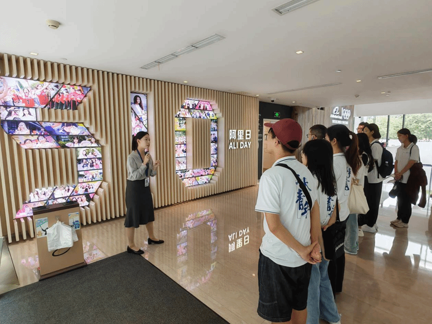 在淘天集团访客中心展厅,讲解员为实践队师生带来了一场精彩的企业发展历程讲解。从1999年阿里巴巴创立之初的创业故事,到如今发展成为全球领先的互联网科技企业,讲解员通过详实的数据和生动的案例,系统梳理了集团的发展轨迹,特别重点介绍了淘天集团作为阿里巴巴核心业务板块的战略定位,以及在电商平台技术创新、AI应用研发等领域取得的突破性进展。通过展厅内丰富的图文资料、互动展示和实物展品,同学们不仅了解到阿里巴巴"让天下没有难做的生意"的企业愿景,更深刻感受到其在科技创新、社会责任等方面的卓越实践。淘天集团独特的"战袍文化"、充满人文关怀的"阿里日"、践行绿色发展的"低碳行动"以及激励员工成长的"年陈文化",都给师生们留下了深刻印象,让大家真切体会到头部科技企业的文化魅力与社会担当。