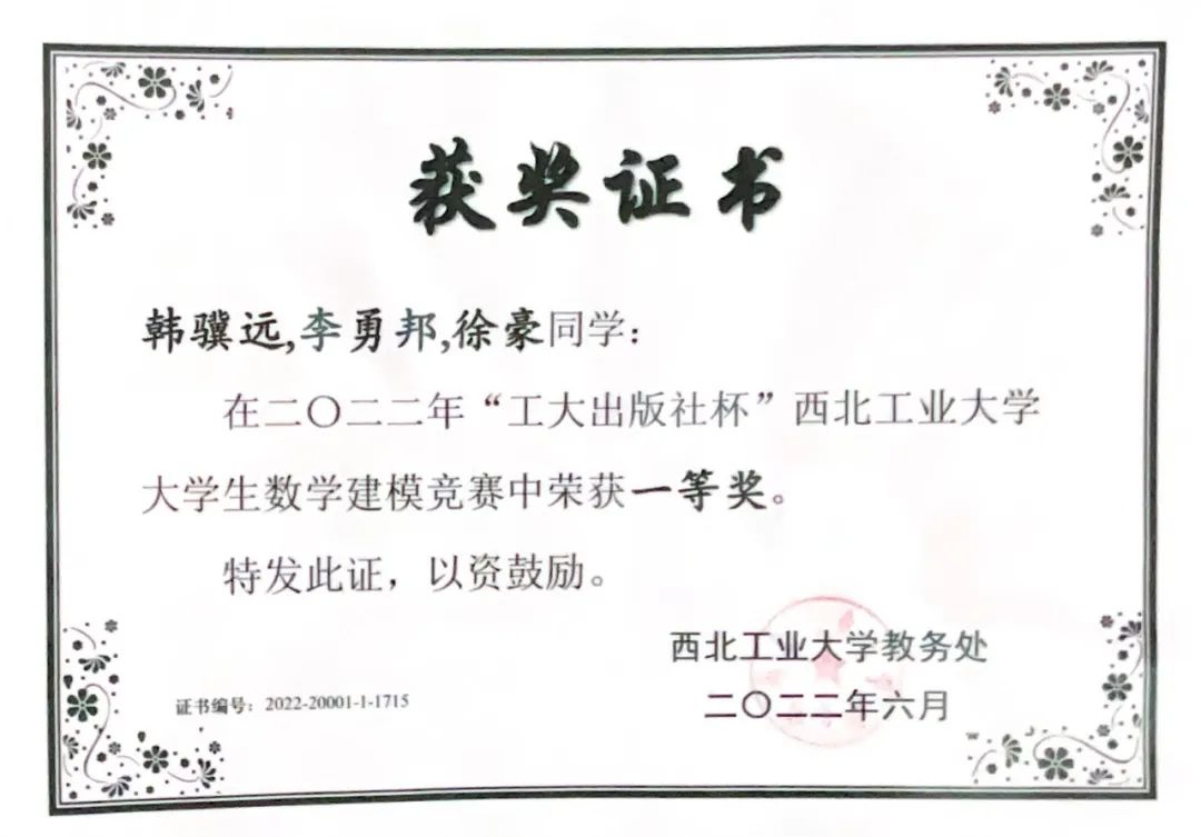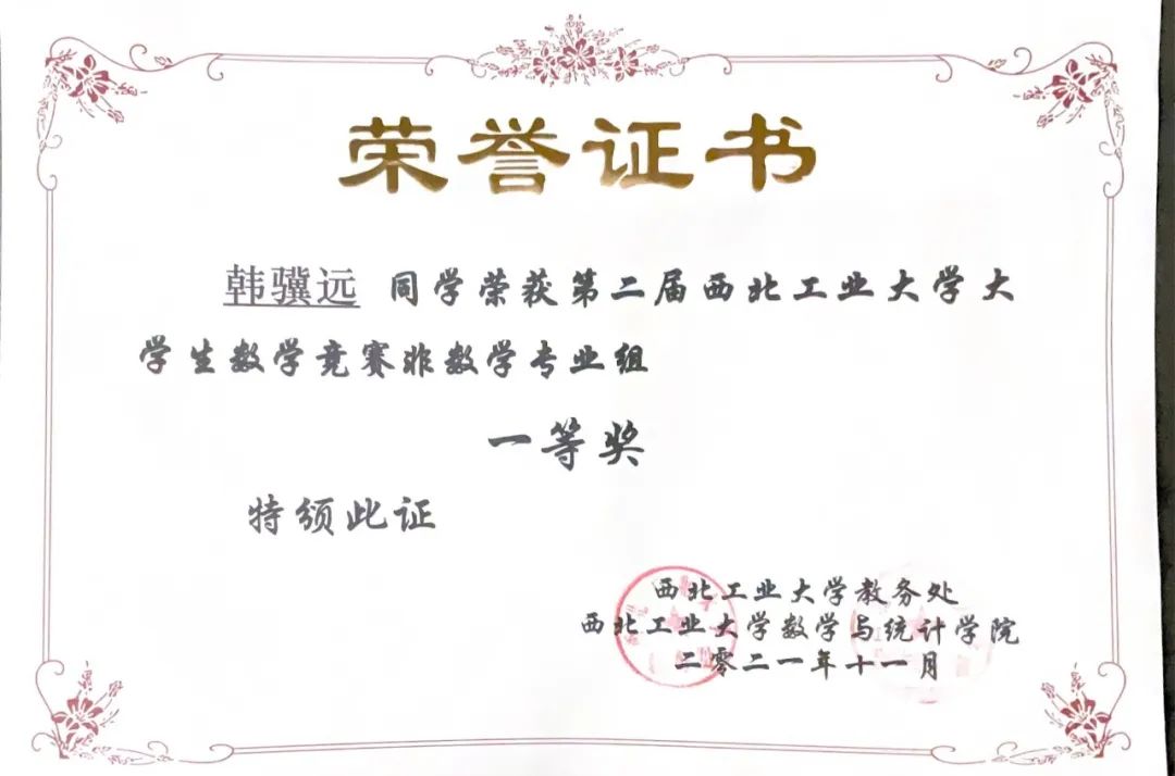 大一学年和大二学年学分积与综合测评均保持年级第一名,获得国家奖学金,校一等奖学金,优秀大学生,优秀共青团员,多项先进个人等荣誉。国家级、省级学科竞赛获奖五项,校级十余项。