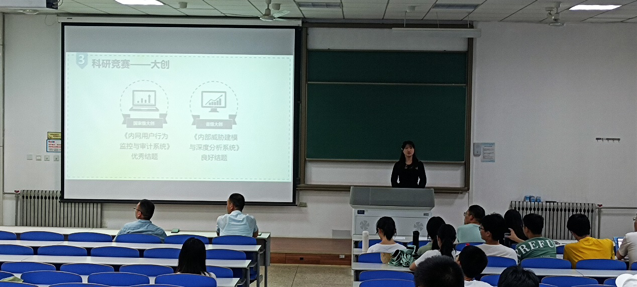 随后,张傲锐学长上台进行了他的分享。他主要讲述了各类竞赛的情况,从计算机类的竞赛到机械电子类的竞赛再到与网安学院息息相关的信息安全类的竞赛,重点介绍了全国大学生信息安全竞赛和各种CTF比赛,给学弟学妹们展示了如何学以致用,在各类竞赛中施展才华,学习技术,提升综合实战能力。