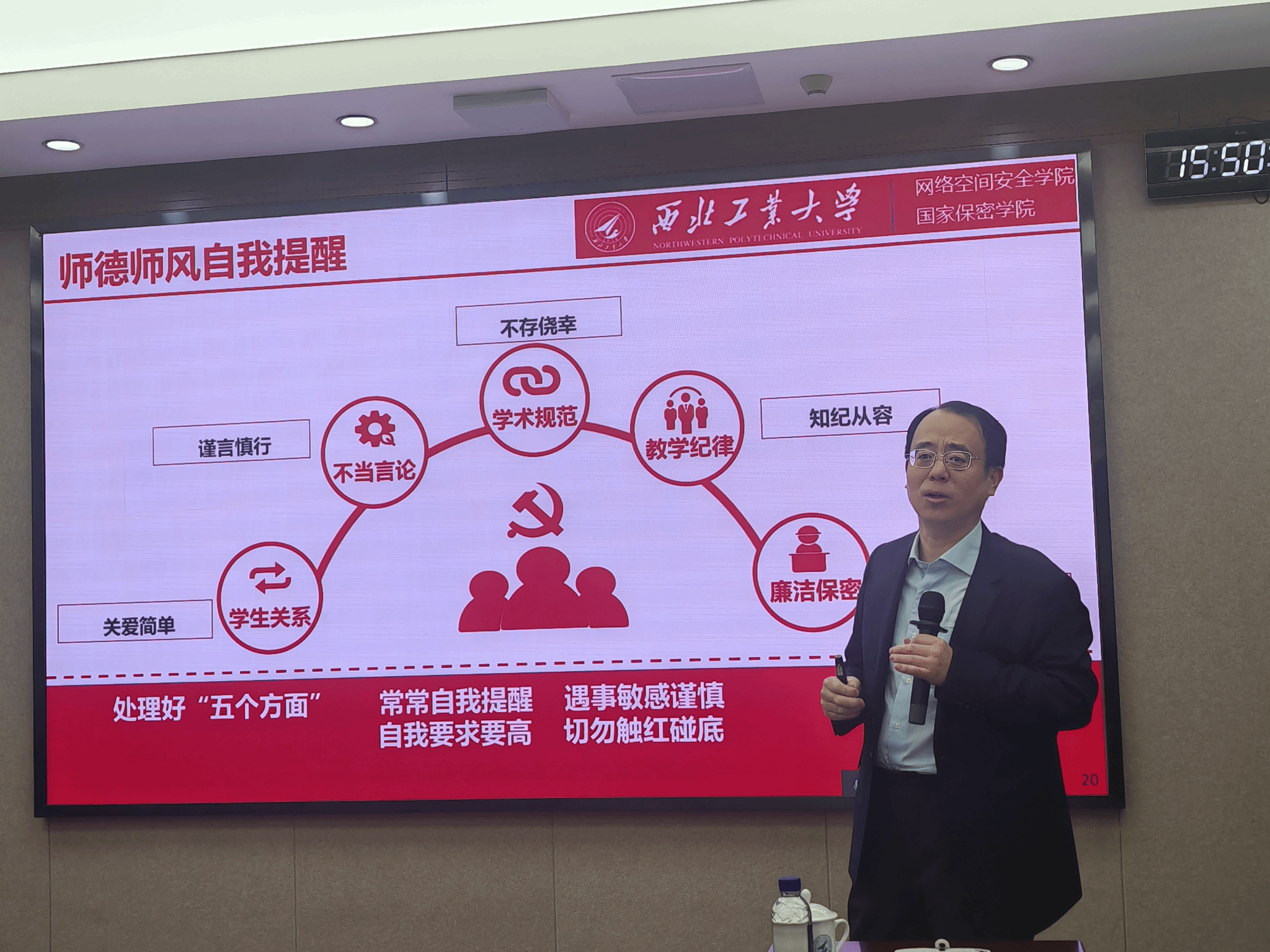 在师德师风培训环节,张文涛结合国家和上级的最新要求,深入解读了教育家精神的内涵。强调每一位教职工都肩负着为党育人、为国育才的神圣使命,在日常教学、科研指导以及与学生相处的点滴中,都要以 “学高为师,身正为范” 为准则。并从持续加强教师思政工作、健全师德师风长效机制、高校教师职业行为准则、高校教师师德失范行为相关惩处等方面开展了培训。