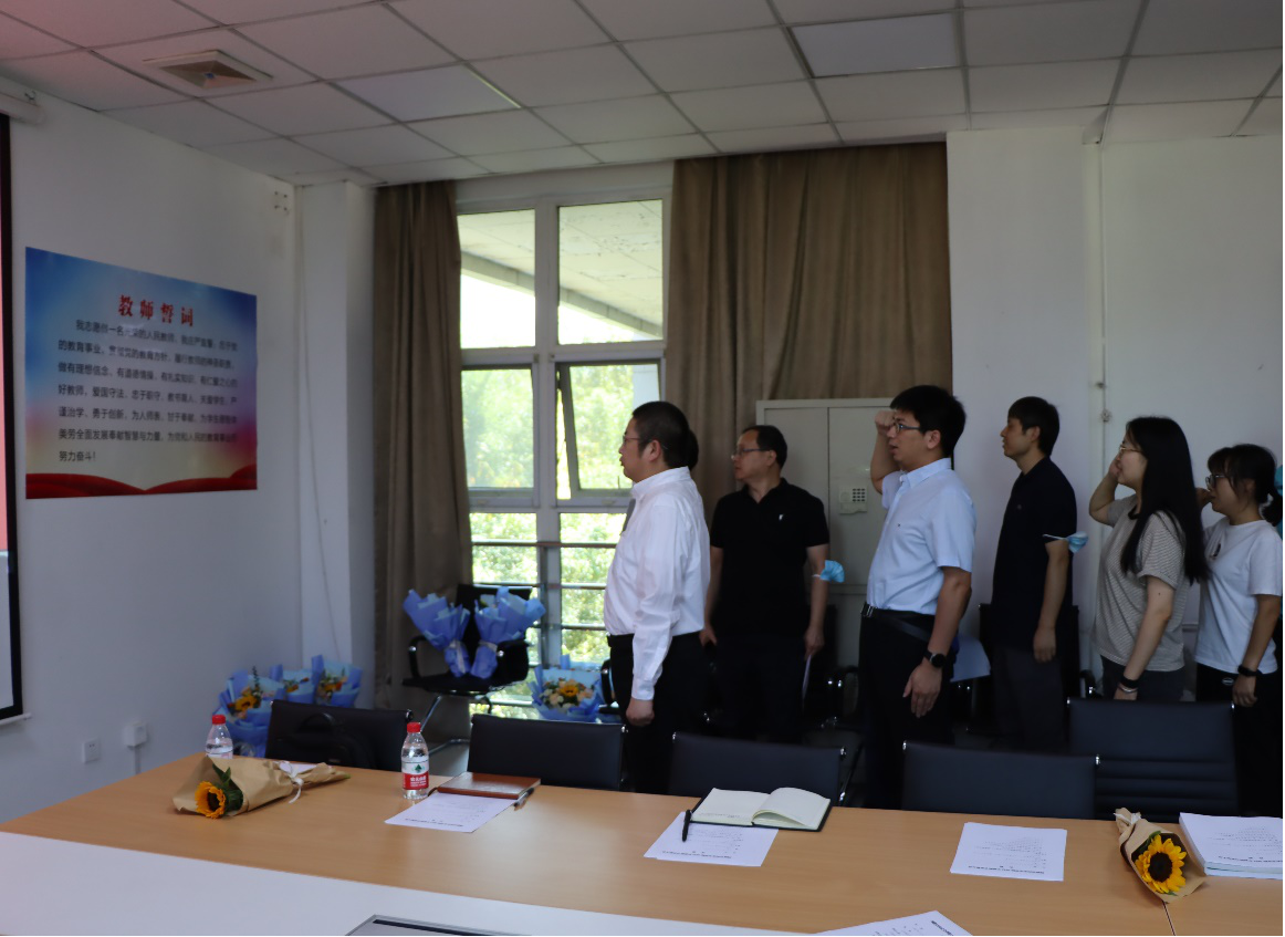 会议首先进行新入职教师宣誓仪式。在张盛兵院长的领誓下,全体新入职教师面向国旗,高举右拳,庄严宣誓:“我志愿做一名光荣的人民教师,我庄严宣誓:忠于党的教育事业,贯彻党的教育方针,履行教师的神圣职责,做有理想信念、有道德情操、有扎实知识、有仁爱之心的好教师,爱国守法、忠于职守,教书育人、关爱学生,严谨治学、勇于创新,为人师表、甘于奉献,为学生德智体美劳全面发展奉献智慧与力量,为党和人民的教育事业而努力奋斗!”这是公开的宣告,也是郑重的承诺。铮铮誓言铿锵落地,回荡在每个人的耳边,激发现场每位教师心中油然而生强烈的荣誉感、自豪感、责任感、使命感。