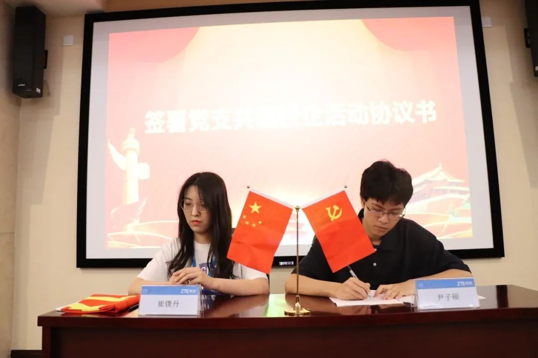 随后,我院学生第七支部与中兴通讯人力资源西安党支部签署了党支部共建校企活动协议书。并由学生第七党支部副书记尹子硕领学习近平著作宣读相关篇章,双方共上了一堂党课。